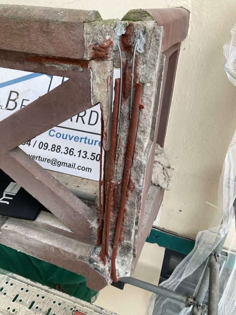 Les armatures trop altérées ont été remplacées afin de rétablir la capacité portante de l’ouvrage. L’ensemble a ensuite été restauré à l’aide d’un mortier fibré sans retrait, permettant de retrouver les volumes d’origine tout en préservant l’esthétique de la façade patrimoniale.