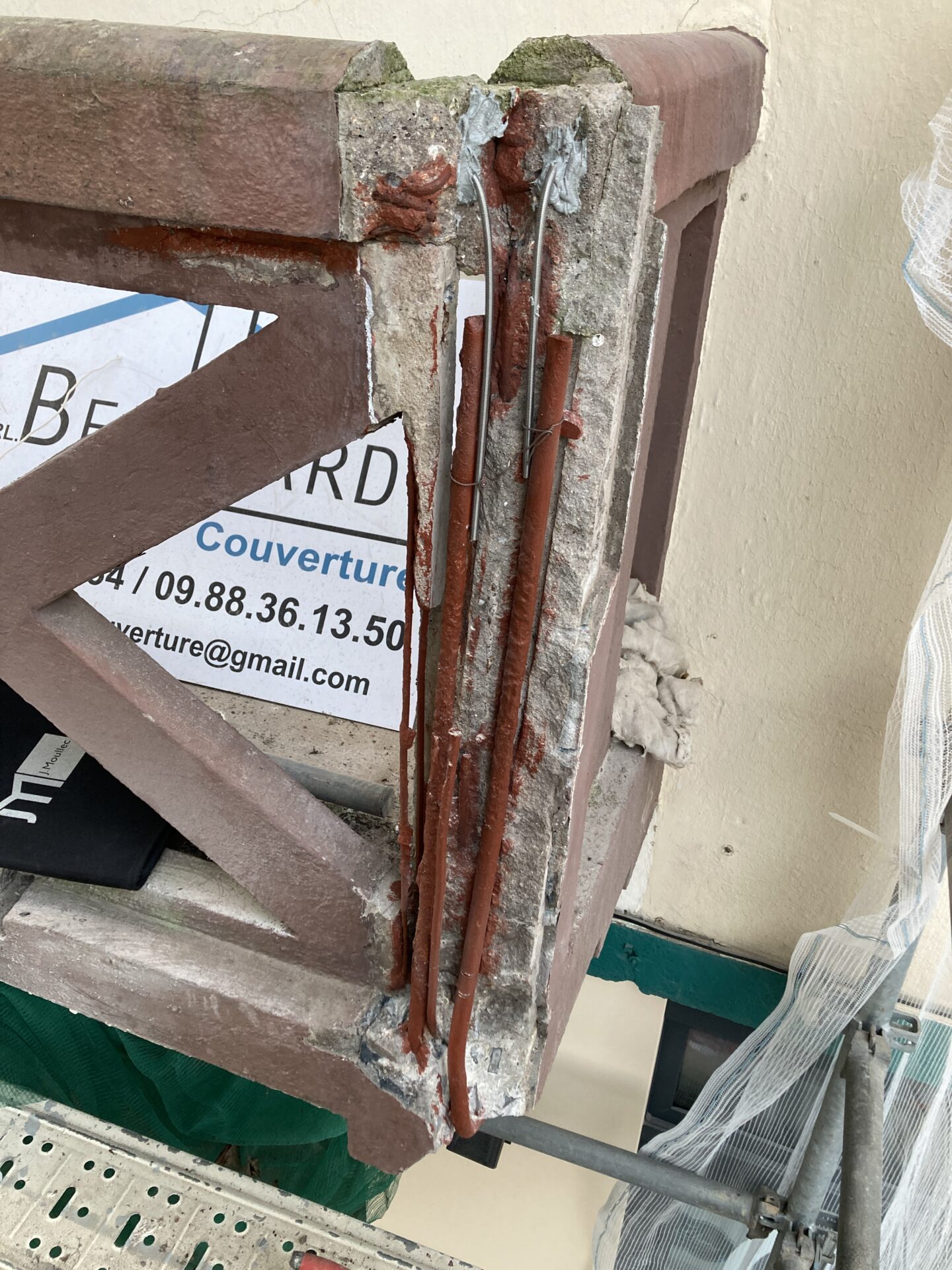 Nos travaux ont consisté à sécuriser et restaurer le balcon en béton armé, en procédant à la purge des zones de maçonnerie dégradé puis au traitement anticorrosion des aciers conservés.